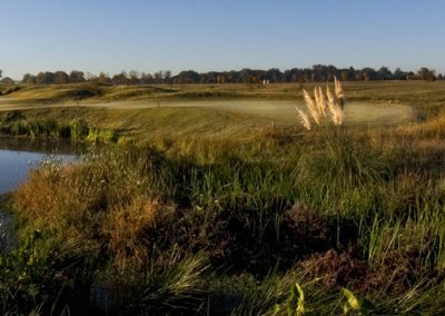 Chosen also as the most beautiful hole in the course, the 9th is a long par 4 of 412 yds “with options” as Jack called it. Taking the right side you can shorten your way flying over the 4 bunkers protecting the landing area, while if you take the left side you can avoid risks but will have a longer more complicated approach, to an elevated diagonal crossing green, protected with a deep bunker for short shots.